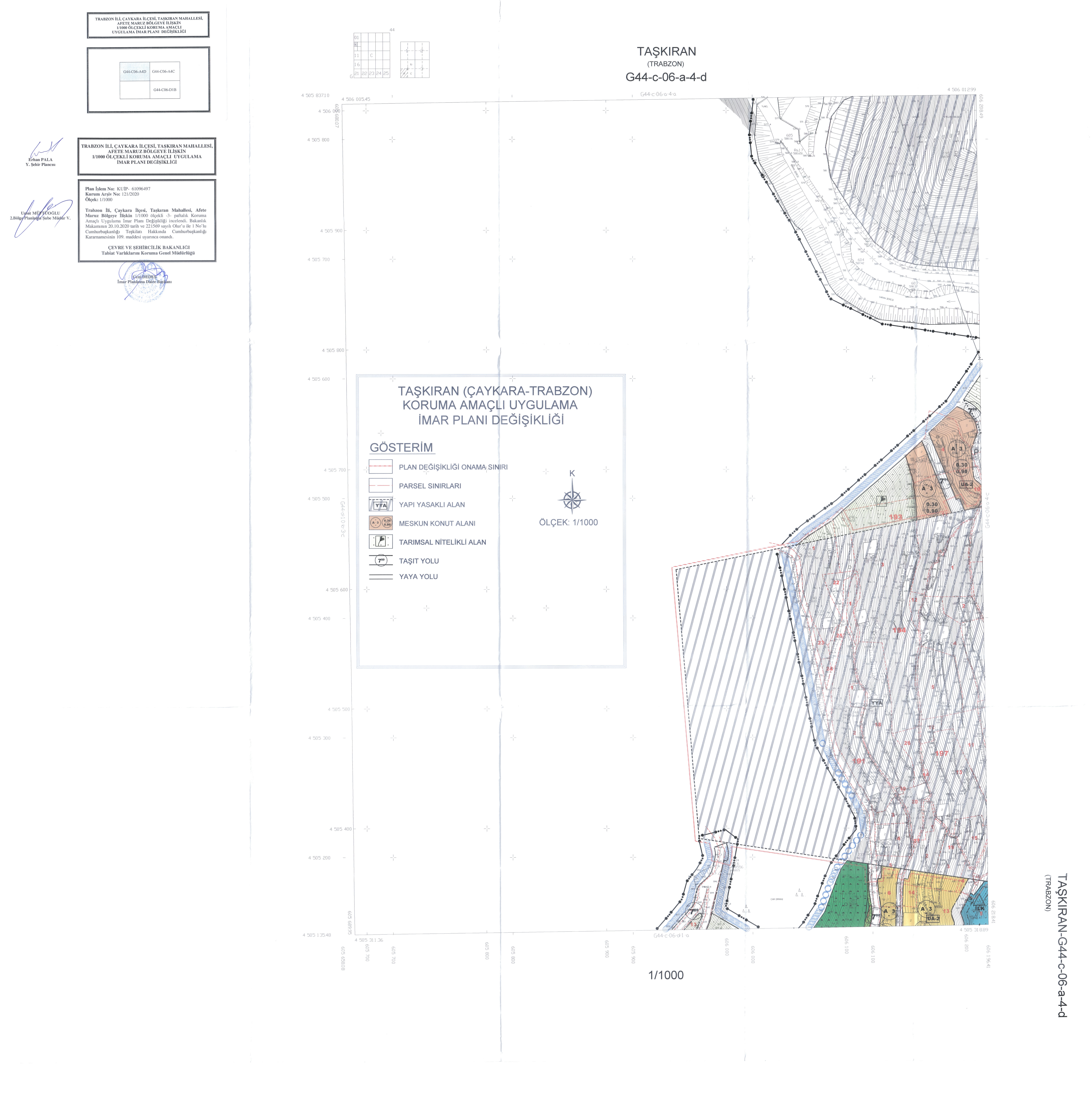Trabzon İl, Çaykara İlçesi, Taşkıran Mahallesi, Afete Maruz Bölgeye ilişkin 1/5000 ölçekli Koruma Amaçlı Nazım İmar Planı Değişikliği ve 1/1000 ölçekli Koruma Amaçlı Uygulama Planı Değişikliği, Bakanlık Makamının 20.10.2020 tarihli ve 221569 sayılı Olur’u ile 1 nolu Cumhurbaşkanlığı Teşkilatı Hakkında Cumhurbaşkanlığı kararnamesinin 109. Maddesi uyarınca onaylanmıştır. Onaylı KNİP-61787823, KUİP-61096497 Plan İşlem Nolu ve 121/2020 arşiv nolu Trabzon İl, Çaykara İlçesi, Taşkıran Mahallesi, Afete Maruz Bölgeye ilişkin 1/5000 ölçekli Koruma Amaçlı Nazım İmar Planı Değişikliği ve 1/1000 ölçekli Koruma Amaçlı Uygulama Planı Değişikliği, Trabzon Çevre ve Şehircilik İl Müdürlüğü İlan panosunda 1 ay süre ile askıya çıkarılmıştır.
